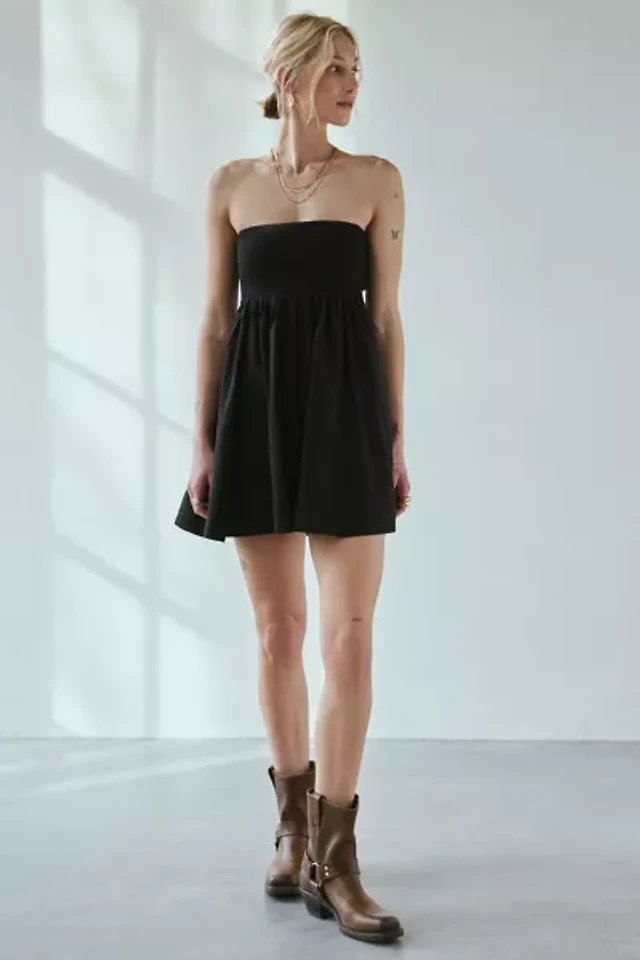 BDG Leah Denim Pleated Open-Back Drop Waist Mini Dress