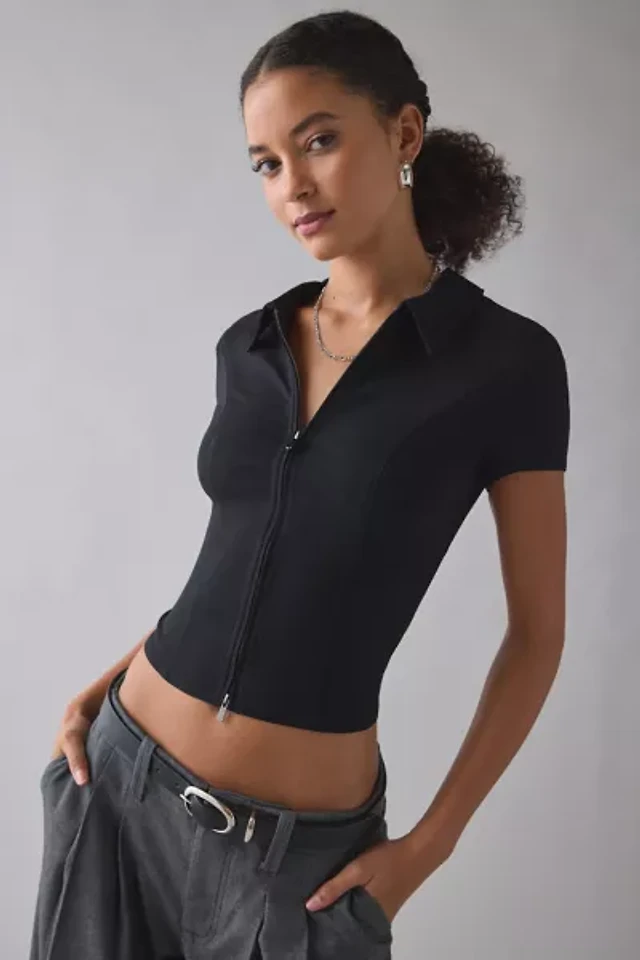 UO Polly Zip-Front Slim Short Sleeve Denim Shirt