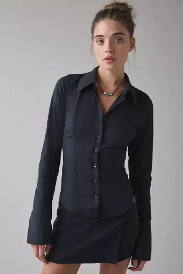 UO Polly Hybrid Slim Short Sleeve Button-Front Shirt