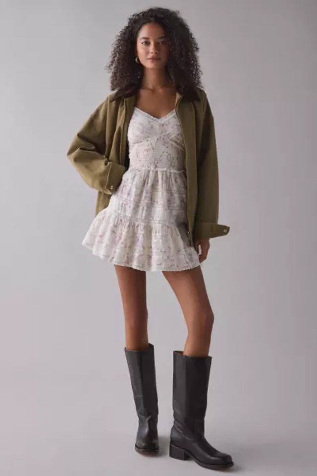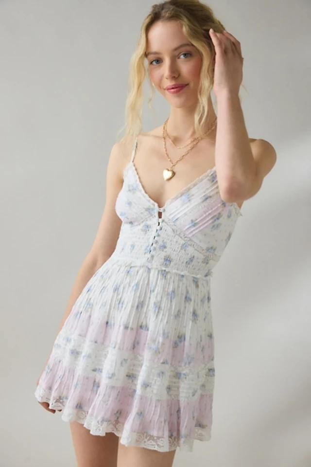 LoveShackFancy Sylara Short Sleeve Lace Trim Silk Mini Dress